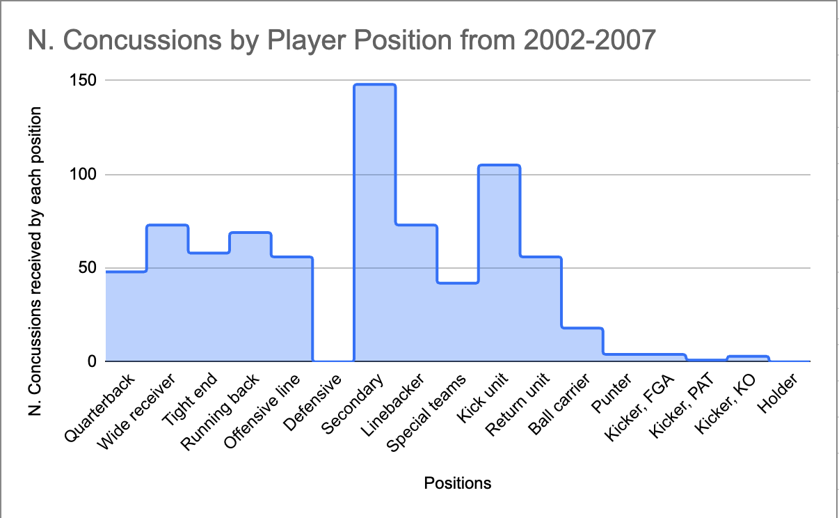 Here we can see the majority of concussions sustained are by the Secondary, Kick Unit, and Wide Receivers.